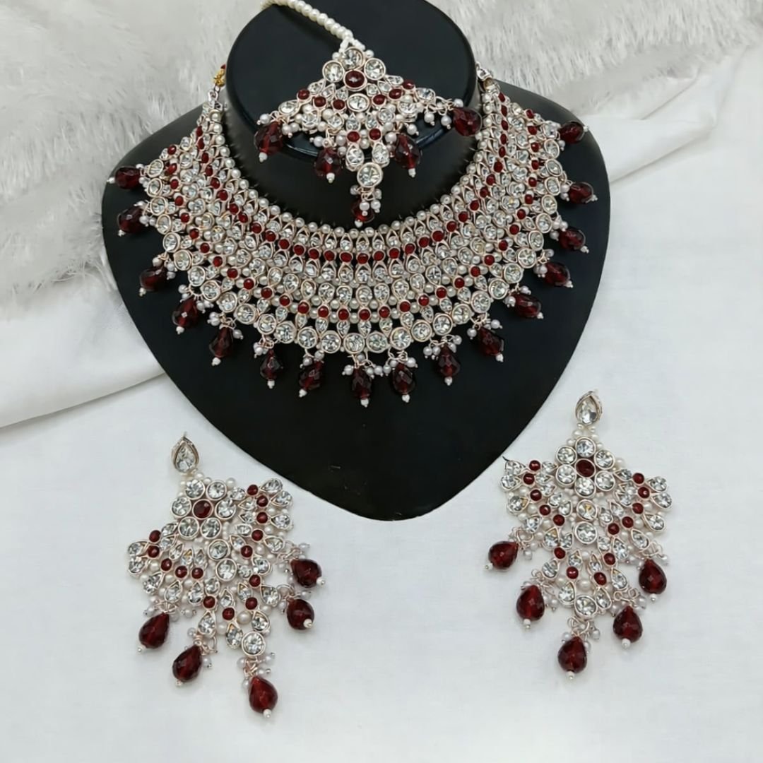 Luxurious patwa-style choker with clear stones and deep ruby-red drops